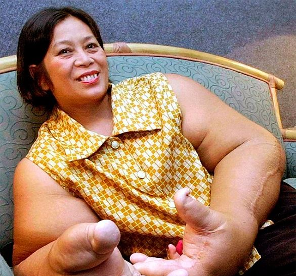 Жительница Таиланда до 20 лет стеснялась выходить из домаиз-за недуга, чтобы люди не видели ее гигантские руки. Однако затем родители заставили Дуангджей Самаксамам работать в семейном магазине, где она трудится до сих пор. Одинокой женщине приходится нелегко, поскольку простейшие операции вроде мытья головы или использования столовых приборов причиняют ей сильную боль. Впрочем, к ней женщина давно привыкла.