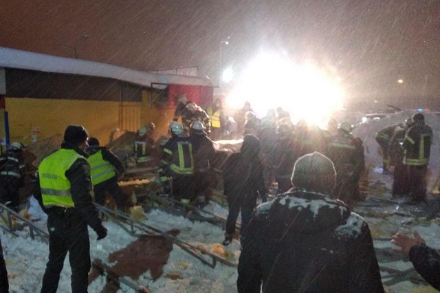 Из-за обильного снегопада на крыше недостроенных торговых рядов образовались сугробы, вес которых металлоконструкции не выдержали и крыша рухнула. Несколько человек оказались под ее обломками.
