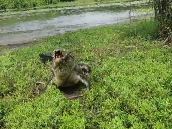 Через минуту борьба человека и хищника переместилась на берег. Крокодил выпустил рыбу изо рта и она понеслась за леской по траве. Хищник бросился за ней, поймал и съел на глазах у рыбака.